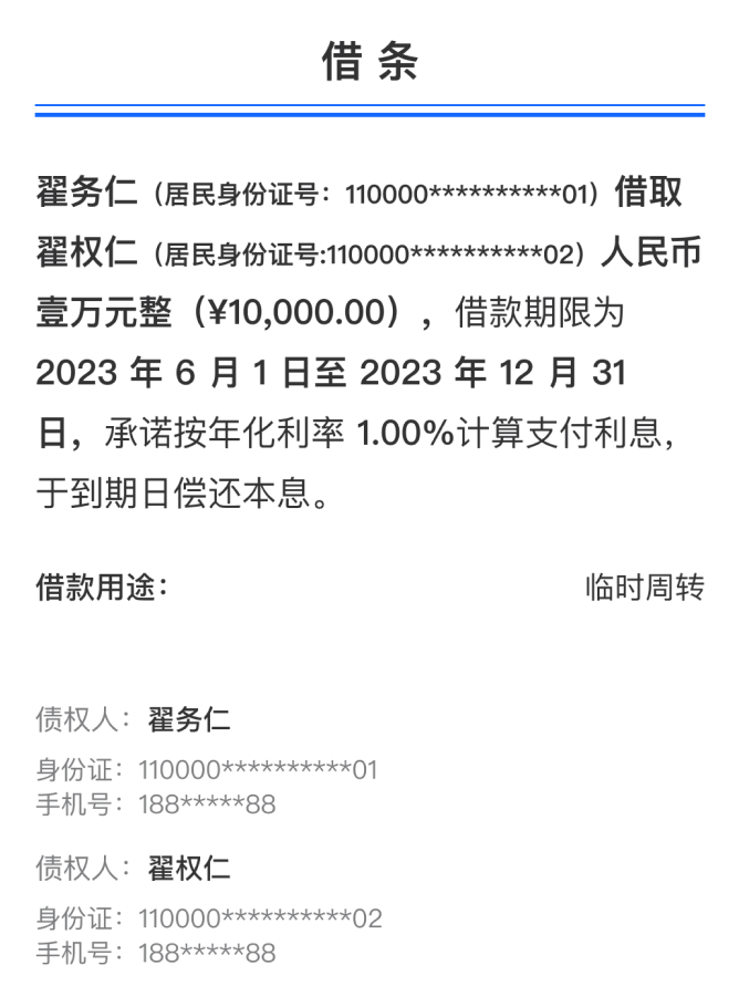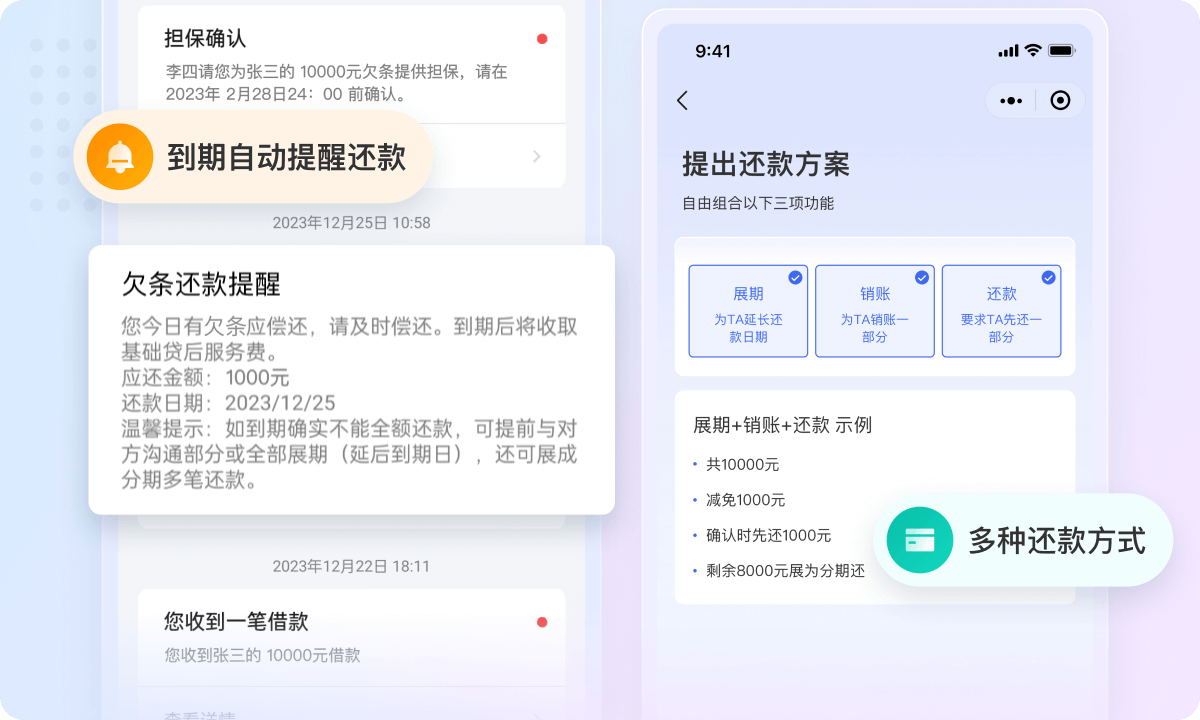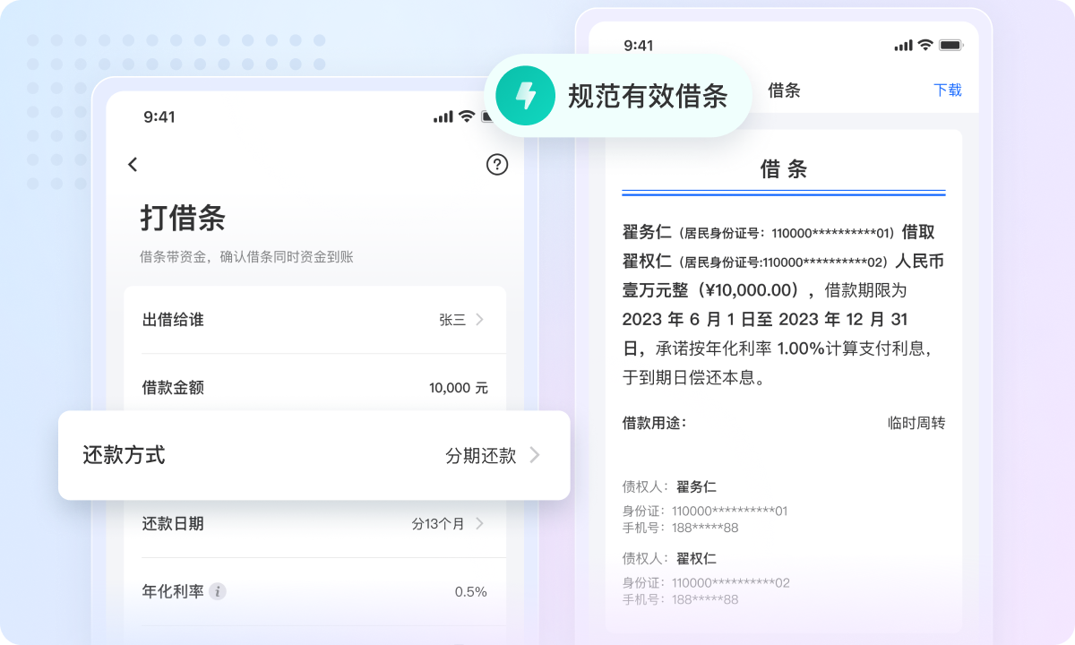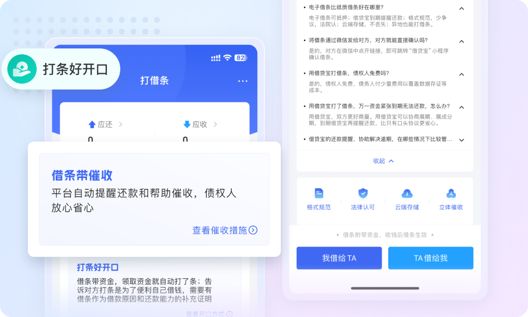 电子借条可抵押;借贷宝到期提醒还款;格式规范,少争议,法院认;云端存储,不丟失;异地也能打借条。