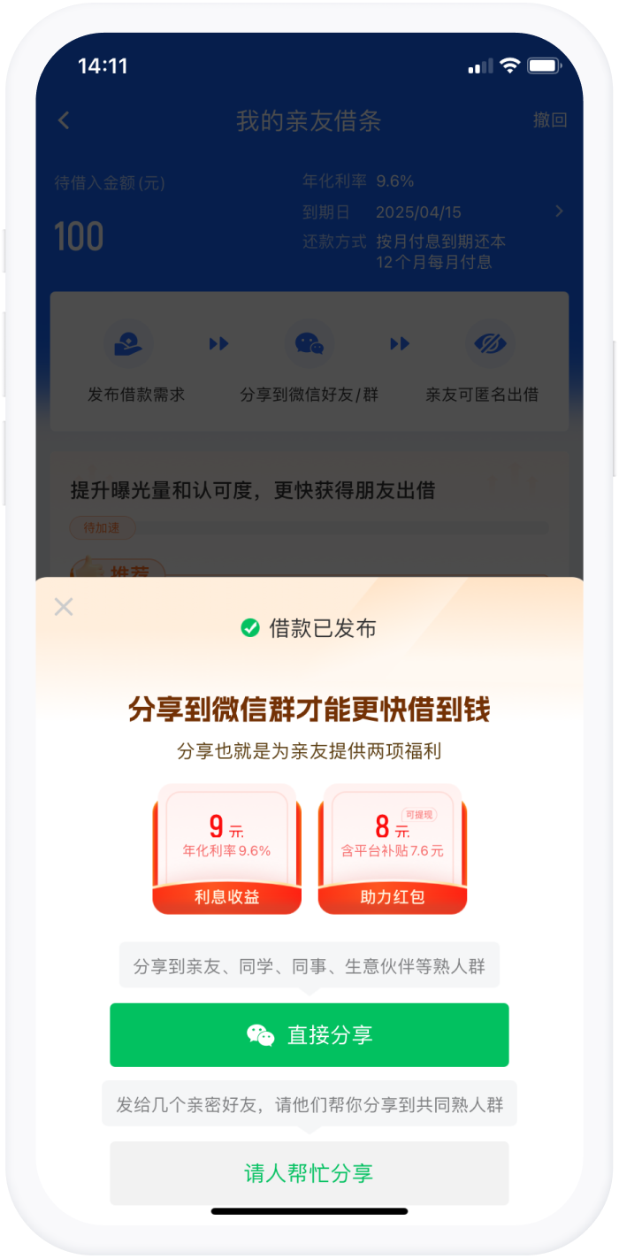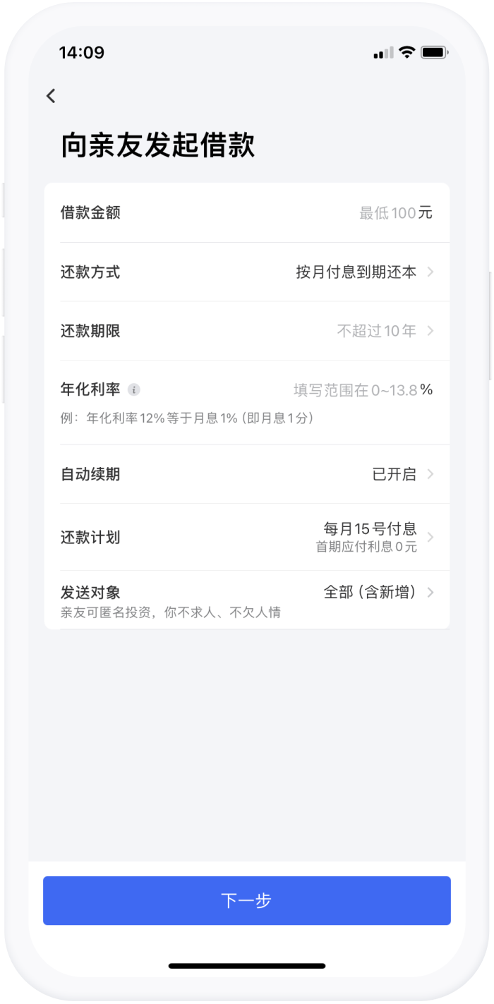 发起借款时,可设置自动续期。借款到期时,如果双方都没有异议,借款人可只支付利息,本金自动续期,直到任何一方提出不再续期。借款人可获得长期资金,出借人投资更开心、放心。
